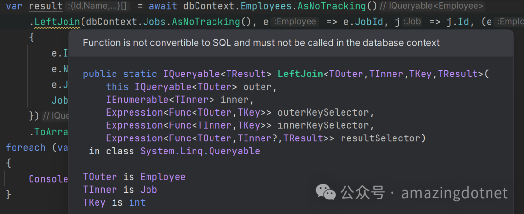 在之前的版本里不能转成 SQL 但从 EF Core 10 开始就可以了,ReSharper 后续应该会有所改进避免对 LeftJoin/RightJoin 产生 warning 吧