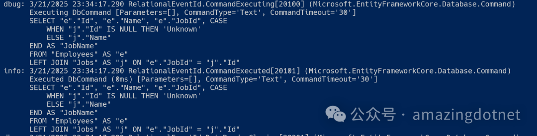 从上面执行的 SQL 可以看得出来我们的 LeftJoin & RightJoin 被正确翻译成了 SQL