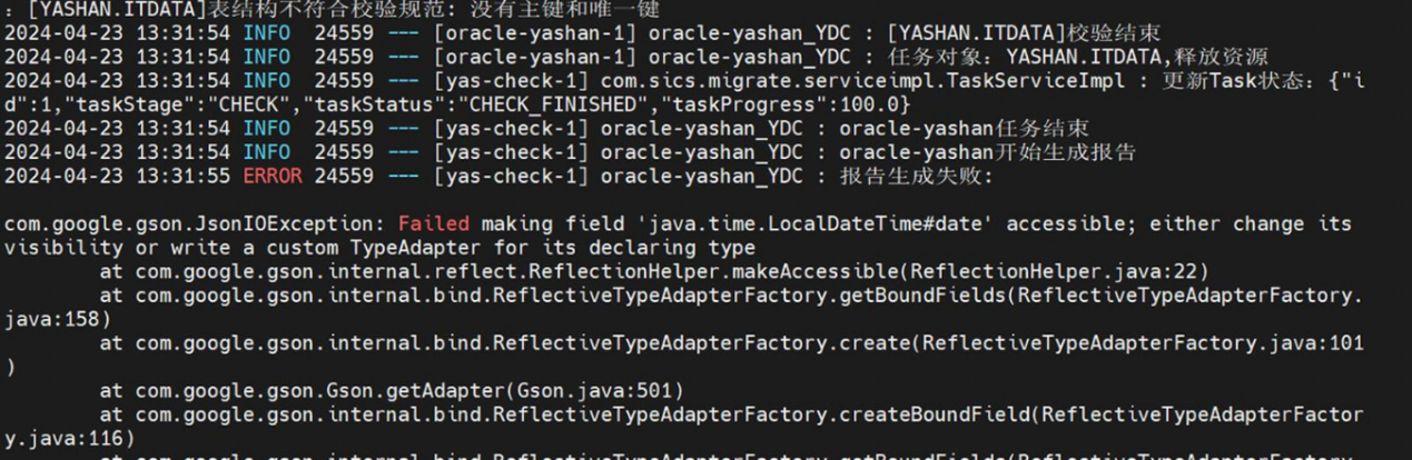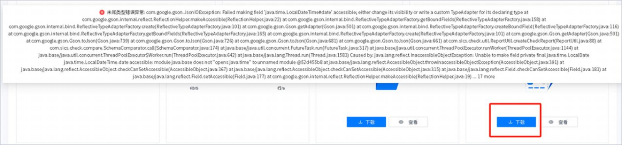 在 YMP Web 控制台界面上,点击某个迁移任务的“下载报告”按钮时,弹出错误提示,报出未知类型错误异常,日志中也能看到异常堆栈信息。