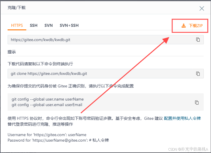 2.打开 KWDB的Gitee页面 → 点击按钮“克隆/下载” → 选择“下载ZIP”。