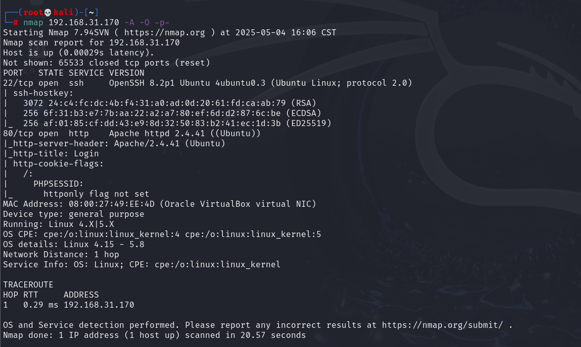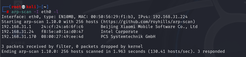 我是用kali的arp-scan,也可以用namp扫网段扫出来。这里可以用很多工具扫出来之举例一种。