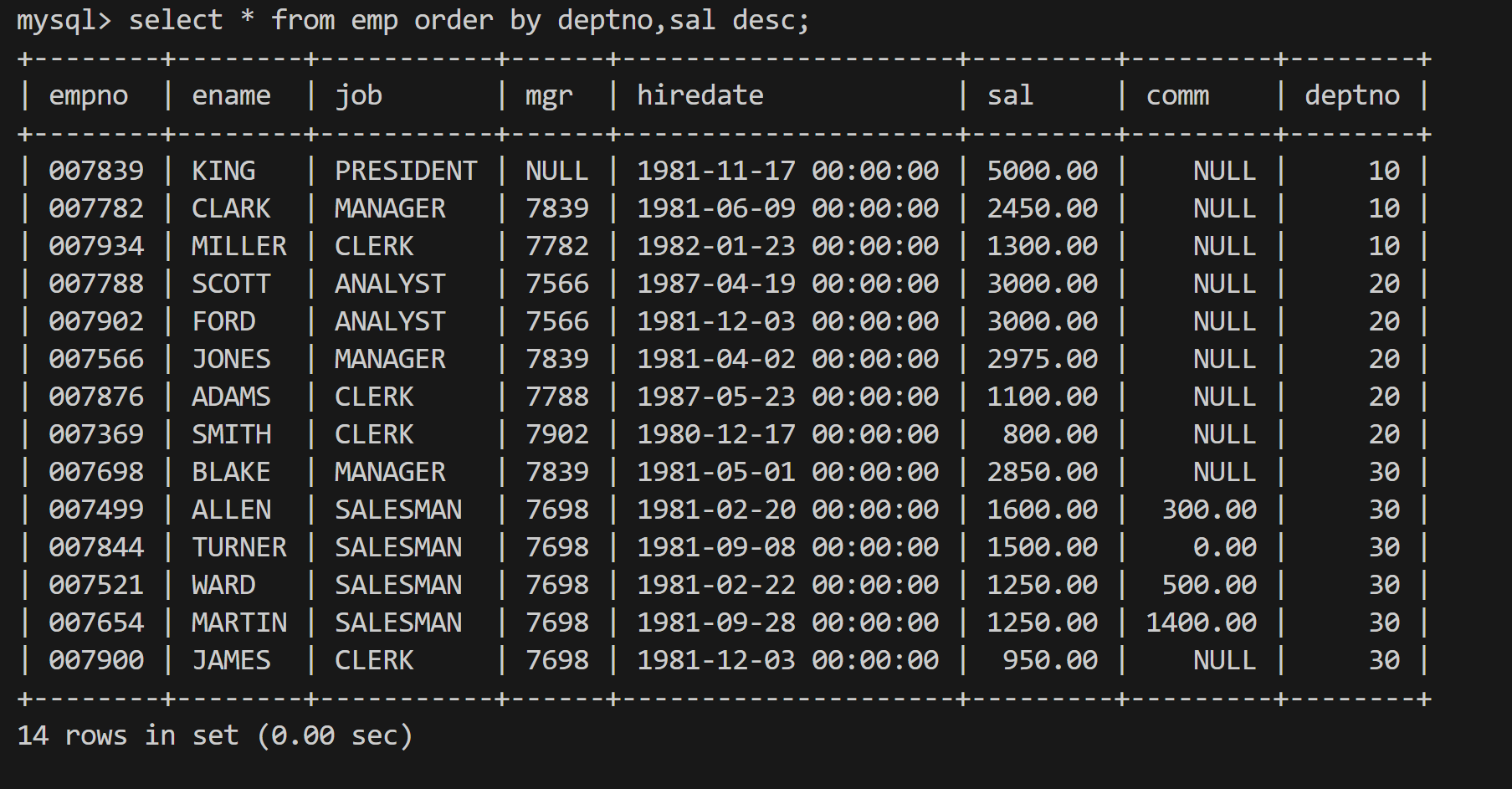 select * from EMP order by deptno, sal desc;排序的时候默认是升序,降序需要自己写desc