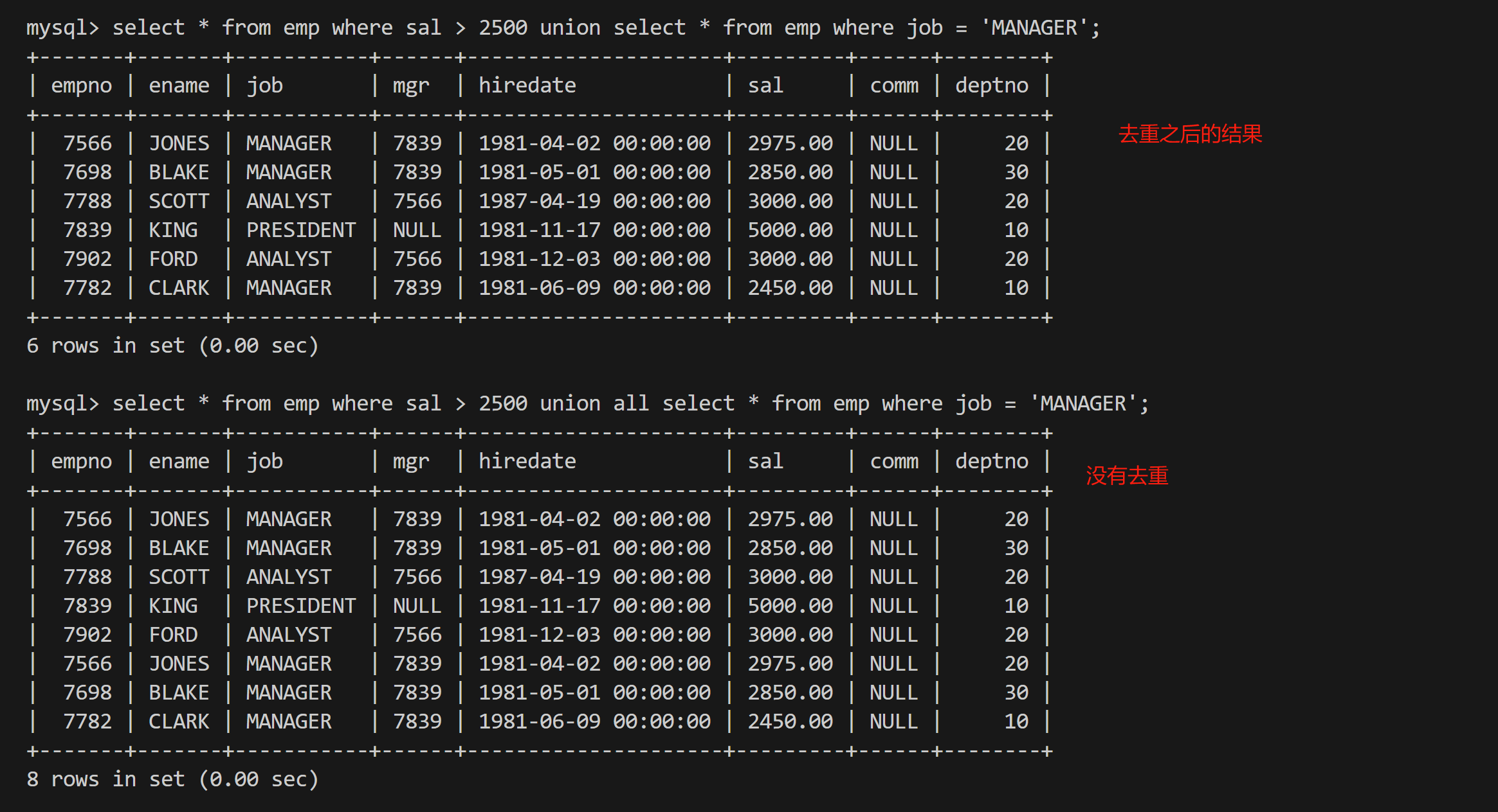 select * from emp where sal > 2500 union all select * from emp where job = 'MANAGER';