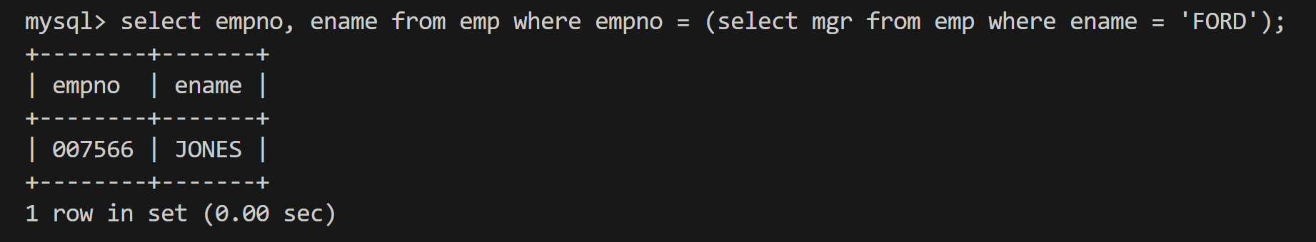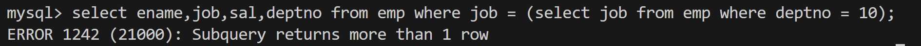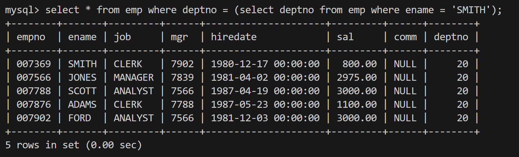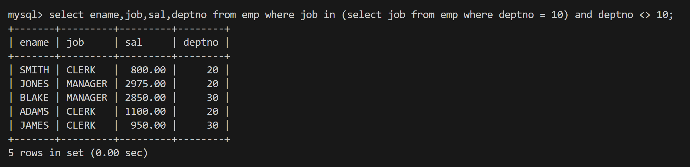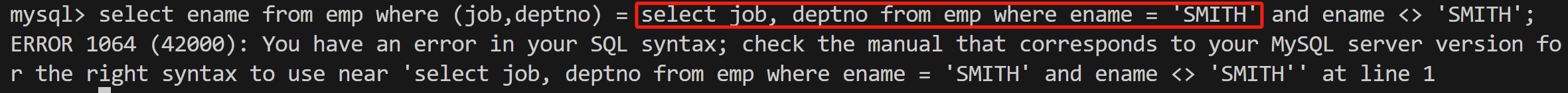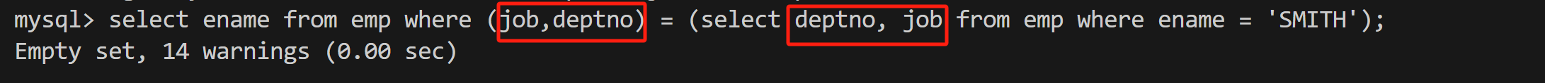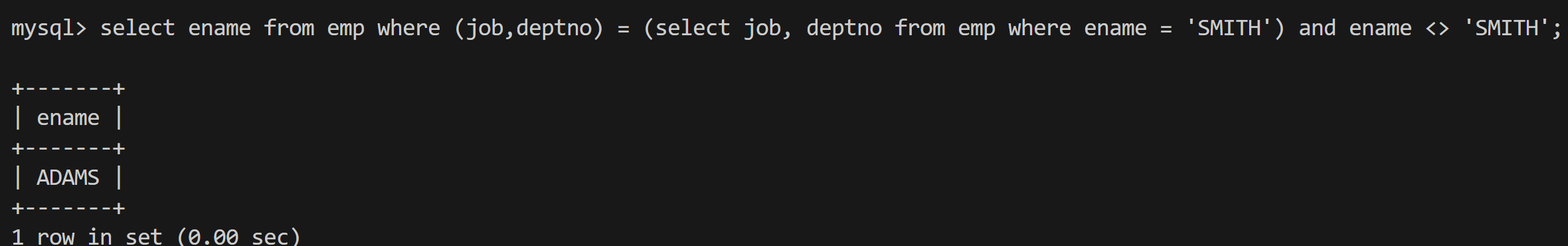 mysql> select ename from EMP where (deptno, job)=(select deptno, job from EMP