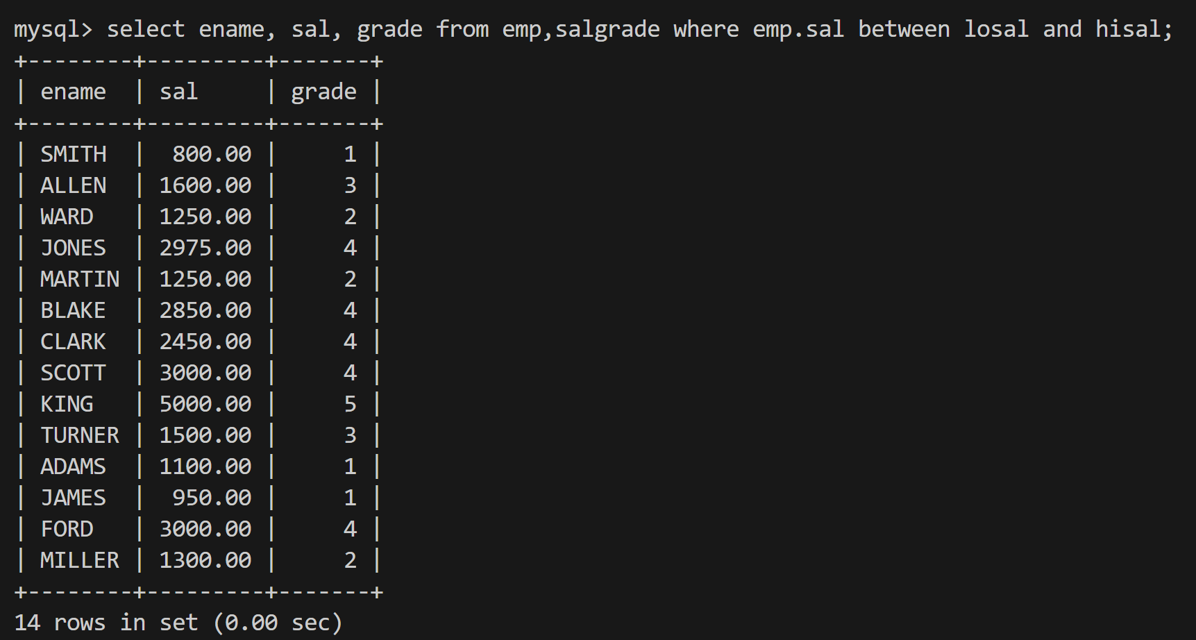 select ename, sal, grade from emp,salgrade where emp.sal between losal and hisal;
