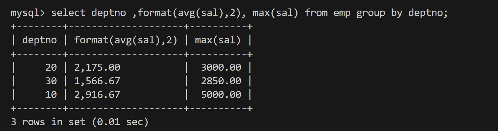 select deptno, format(avg(sal), 2) , max(sal) from EMP group by deptno;FORMAT(AVG(sal), 2) 的作用是将 AVG(sal)(平均工资)格式化为具有两位小数的形式。这是没有格式化的效果: