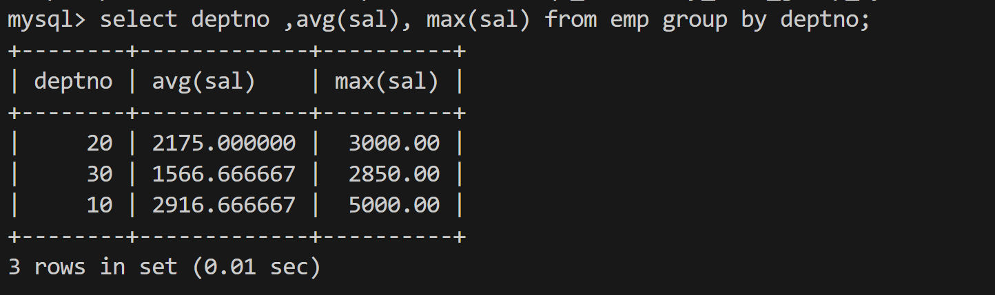 select deptno ,format(avg(sal),2), max(sal) from emp group by deptno;select deptno, avg(sal) as avg_sal from EMP group by deptno having