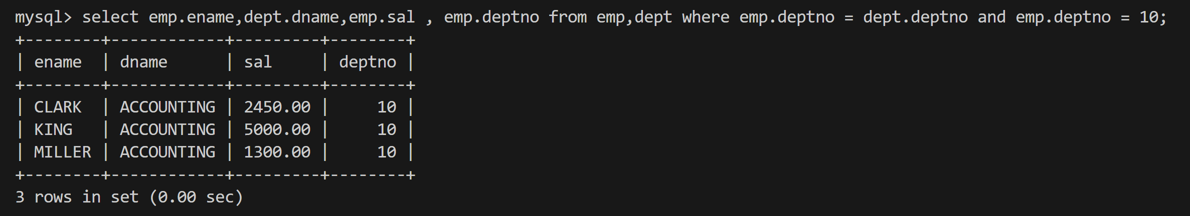 DEPT.deptno;显示部门号为10的部门名,员工名和工资