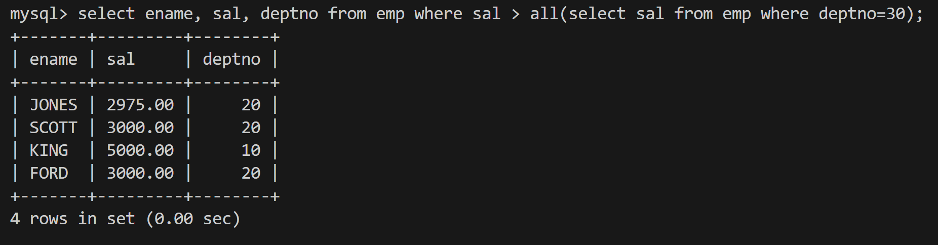 mysql> select ename, sal, deptno from emp where sal > all(select sal from emp where deptno=30);当然直接用函数书写也可以。