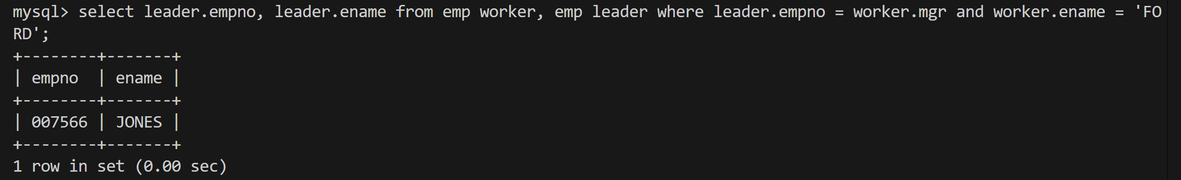 --from emp leader, emp worker,给自己的表起别名,因为要先做笛卡尔积,所以别名可以先识
