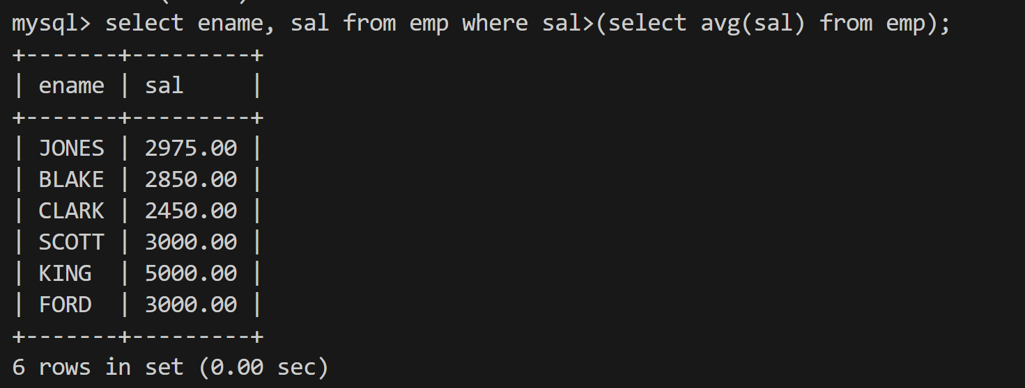 select ename, sal from EMP where sal>(select avg(sal) from EMP);跟上一题本质是一样的