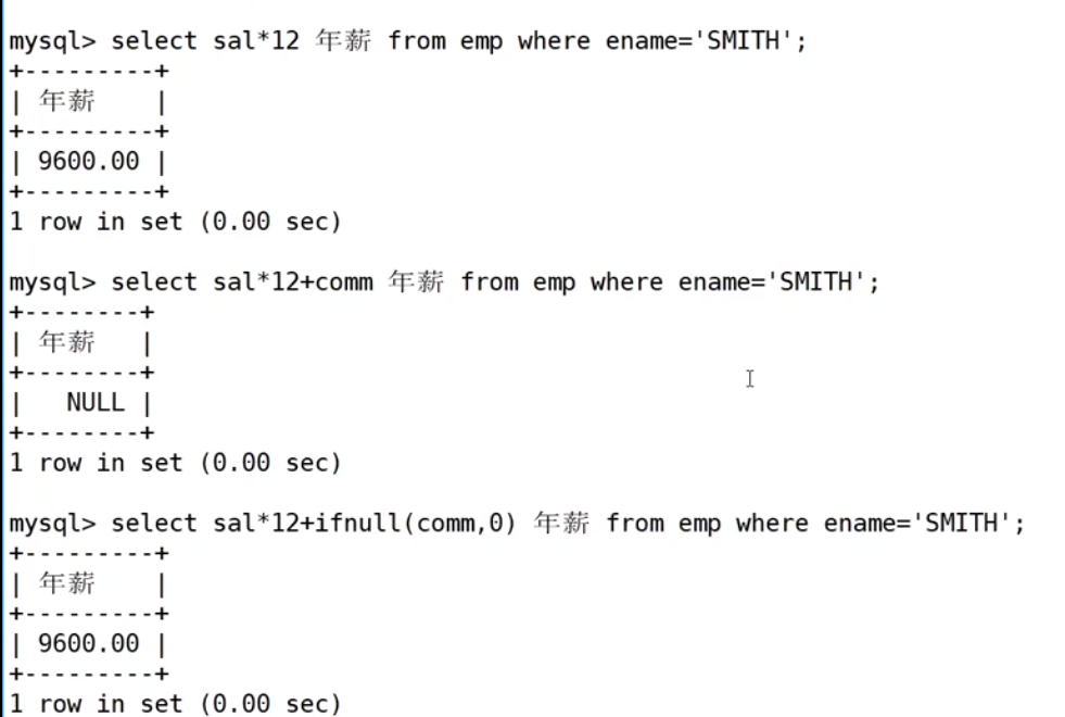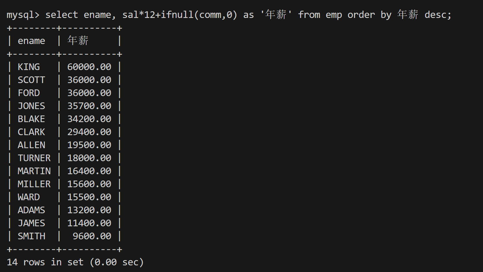为什么最终的年薪是NULL呢,因为我们在表中发现有人的奖金是NULL,而我们的年薪计算方式就是月薪*12 + 奖金,而NULL是不参与计算的,因此最终的结果就是NULL,所以我们需要使用函数ifnull(comm,0),这样就把所有为NULL的数字变成0