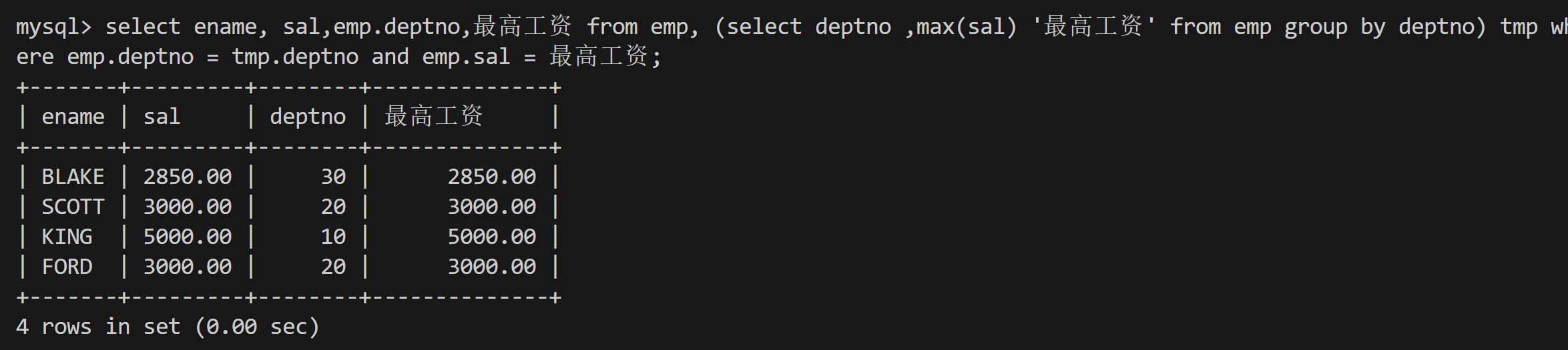 select ename, sal,emp.deptno,最高工资 from emp, (select deptno ,max(sal) '最高工资' from emp group by deptno) tmp where emp.deptno = tmp.deptno and emp.sal = 最高工资;