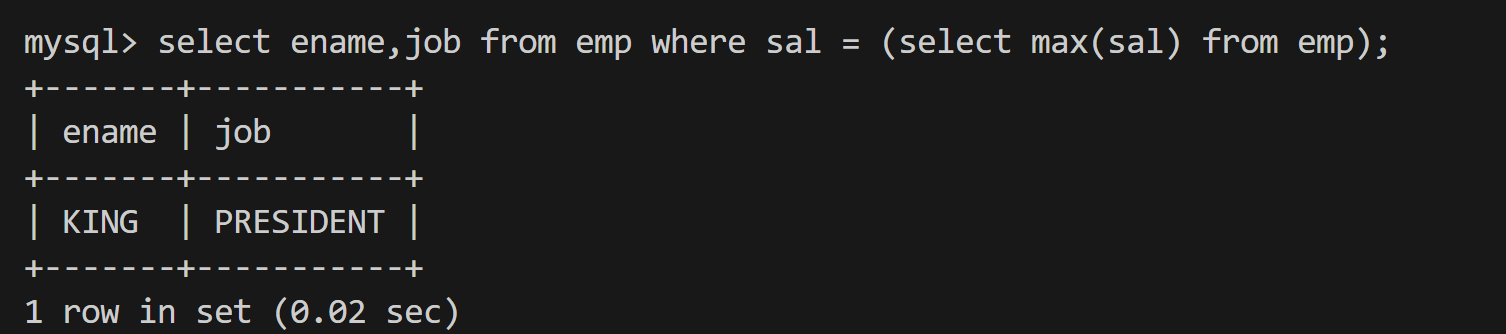 select ename, job from EMP where sal = (select max(sal) from EMP);这就是复合查询的体现,使用max(sal)获得最大薪资,然后获得最大数的薪资即可。