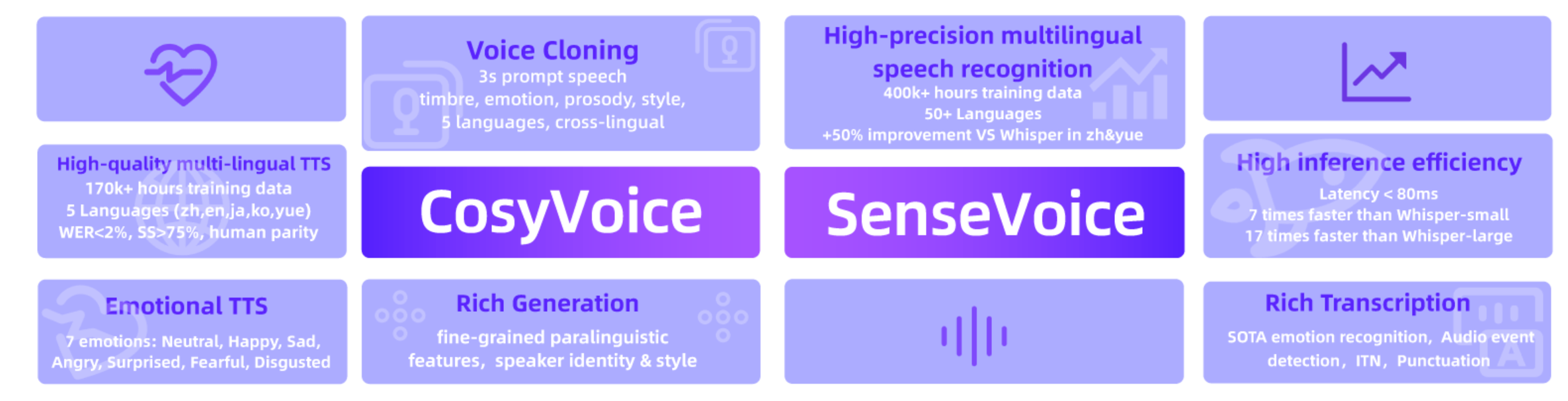 而今天介绍的阿里最新开源项目FunAudioLLM彻底解决了这些问题。它无需任何样本即可完成声音克隆,框架主要包含CosyVoice和SenseVoice两个项目: