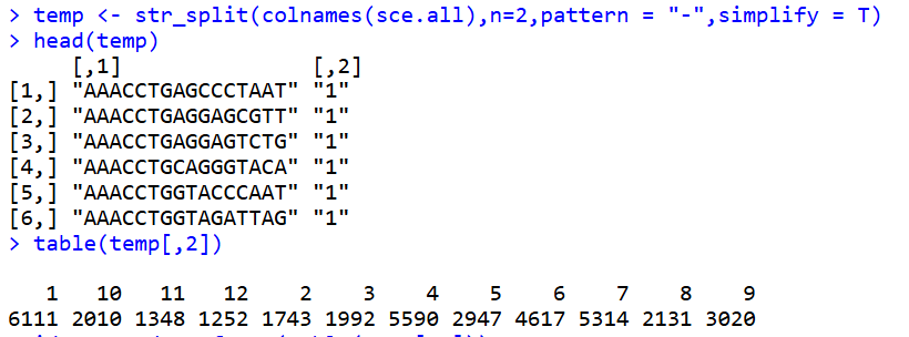 temp <- str_split(colnames(sce.all),n=2,pattern = "-",simplify = T)