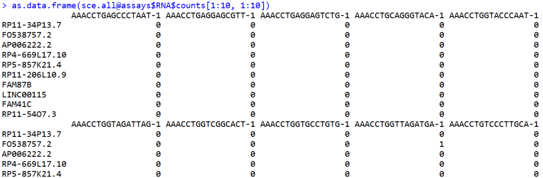 as.data.frame(sce.all@assays$RNA$counts[1:10, 1:10])
