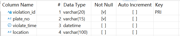 交管系统(DB_Traffic)存储了车辆交通信息,其中违章记录表 traffic_violation 结构如下: