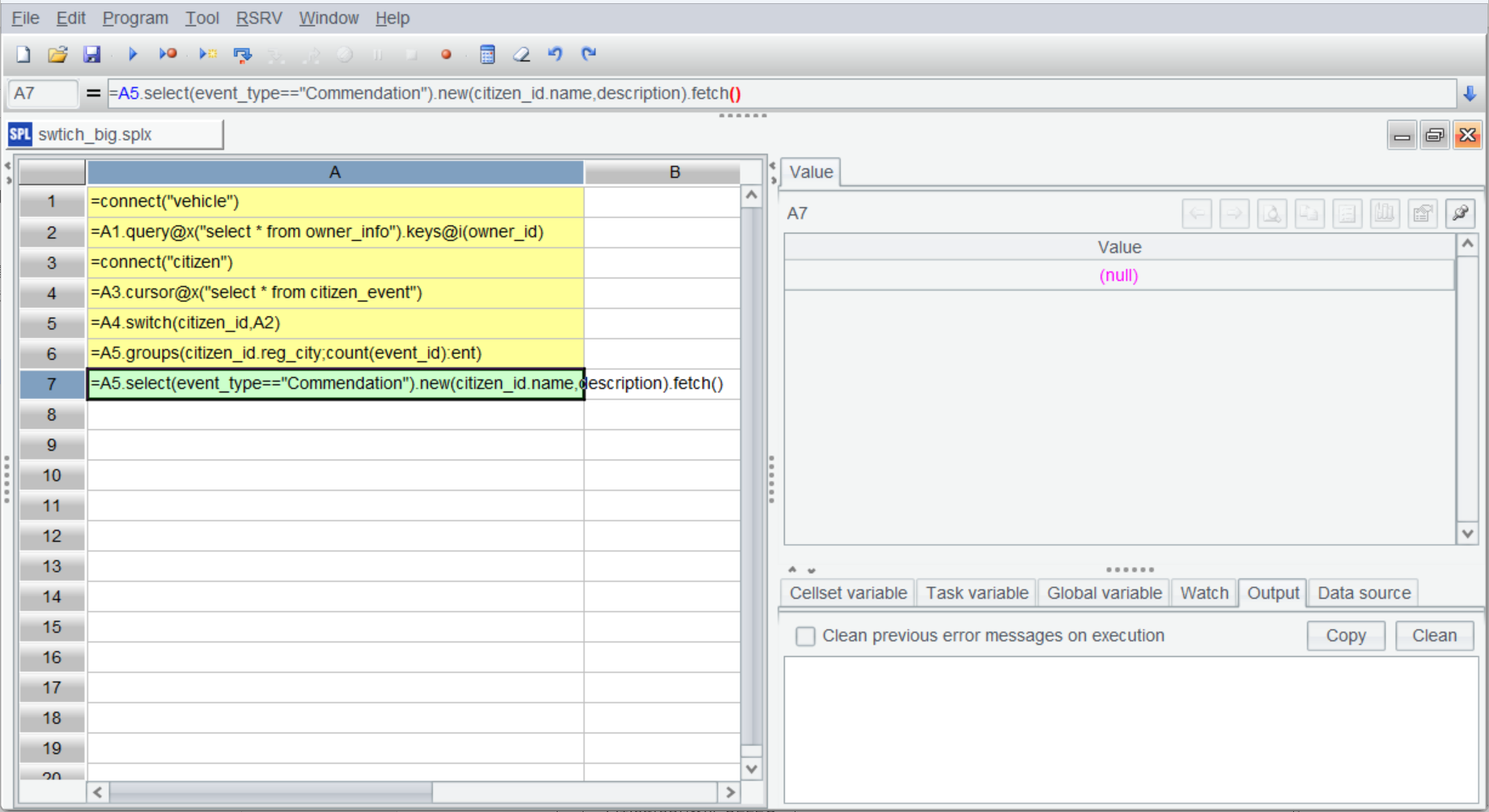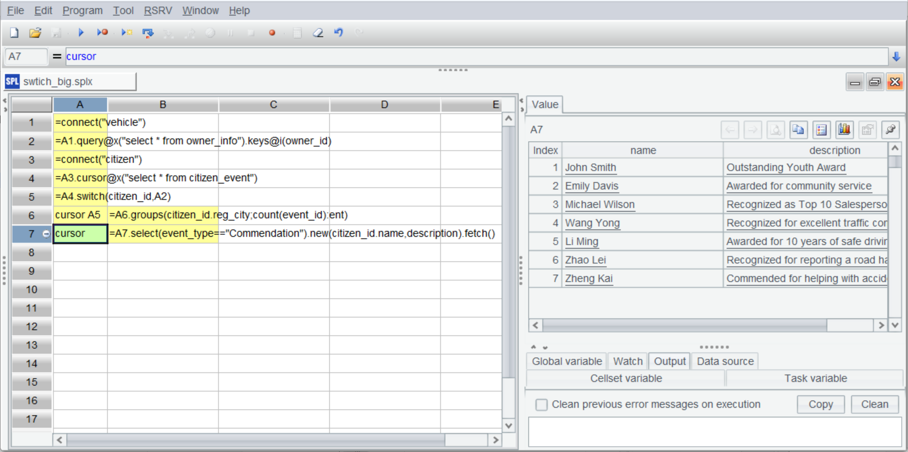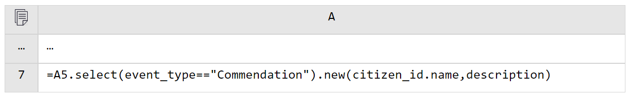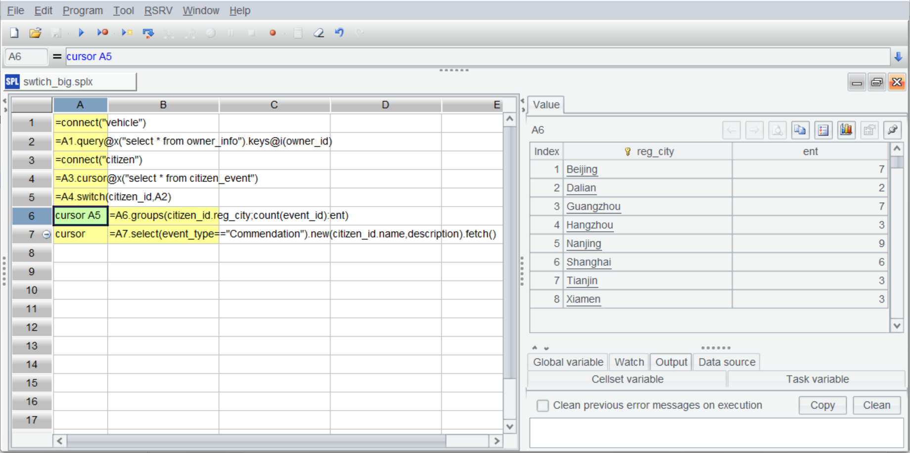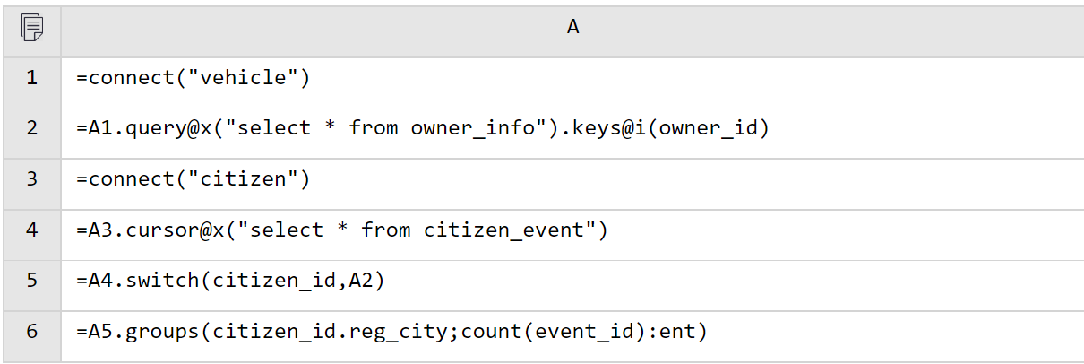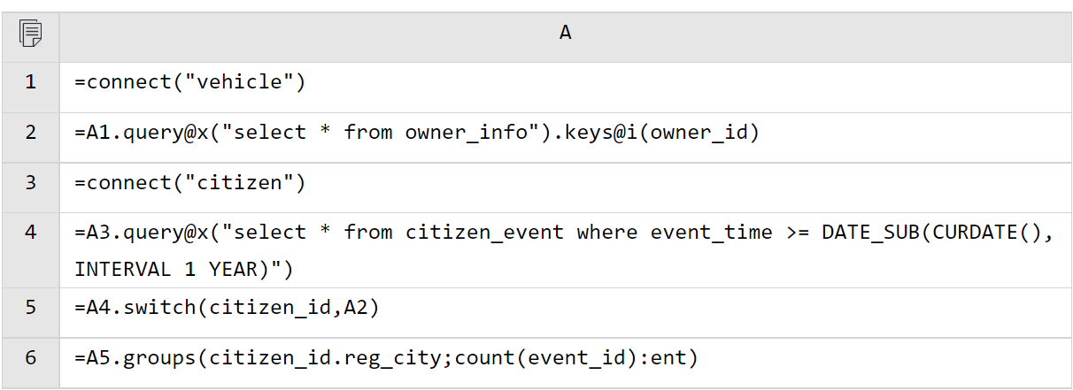 A5 使用 switch 进行外键关联。由于外键指向的维表记录是唯一的,switch 直接将关联字段 citizen_id 转换成 A2 中的记录(实际在内存中存储的是维表记录所在地址)。