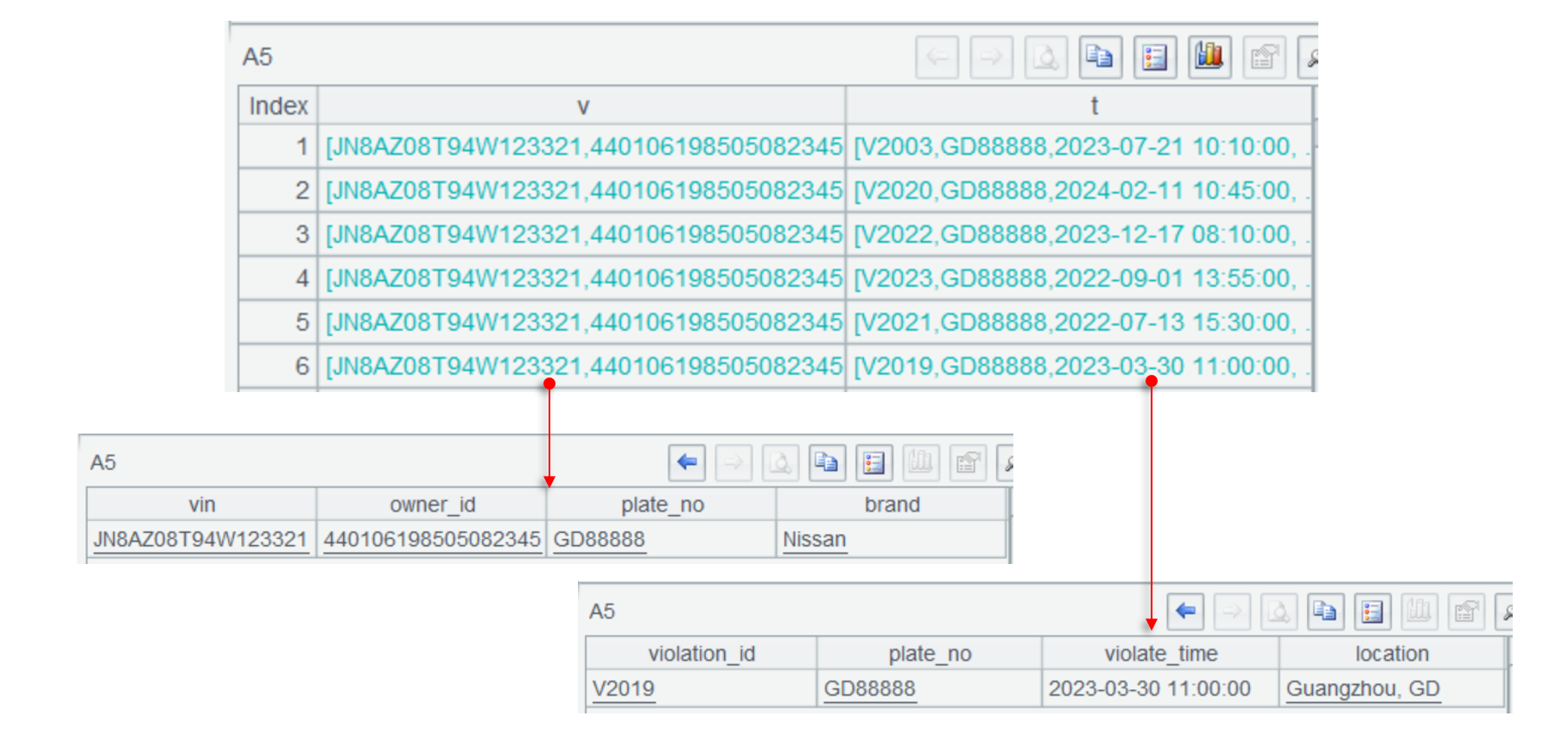 traffic_violation 和 vehicle_master 这两个表也是一对多的关系,规模都可能很大,从后者的角度来看,traffic 更像一个子表,这两个表构成主子关系(plato_no 是 vehicle 表的逻辑主键)。