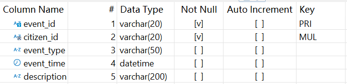 公民信息系统(DB_CitizenEvent)存储了公民相关信息,其中公民事件表 citizen_event 结构如下: