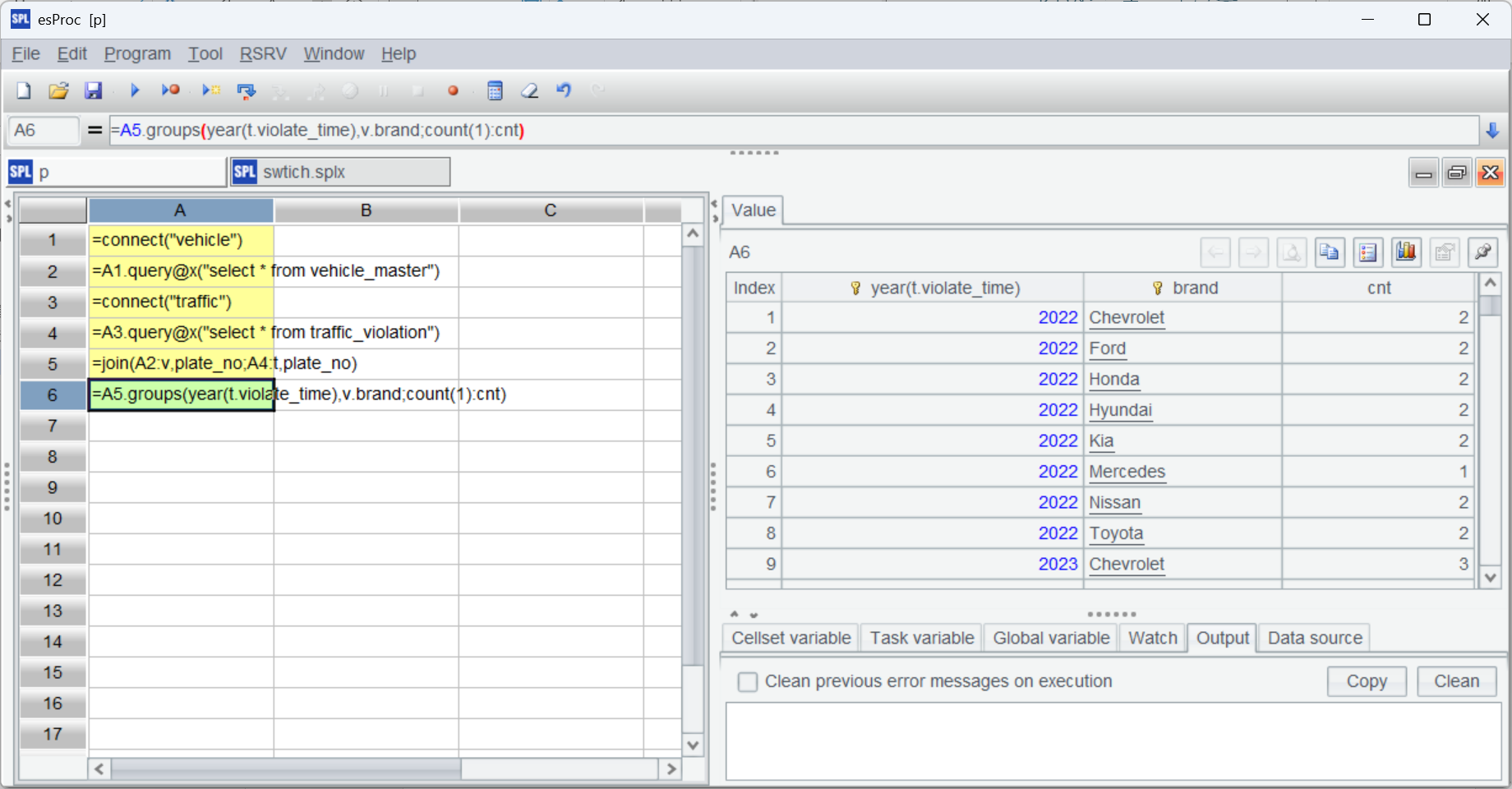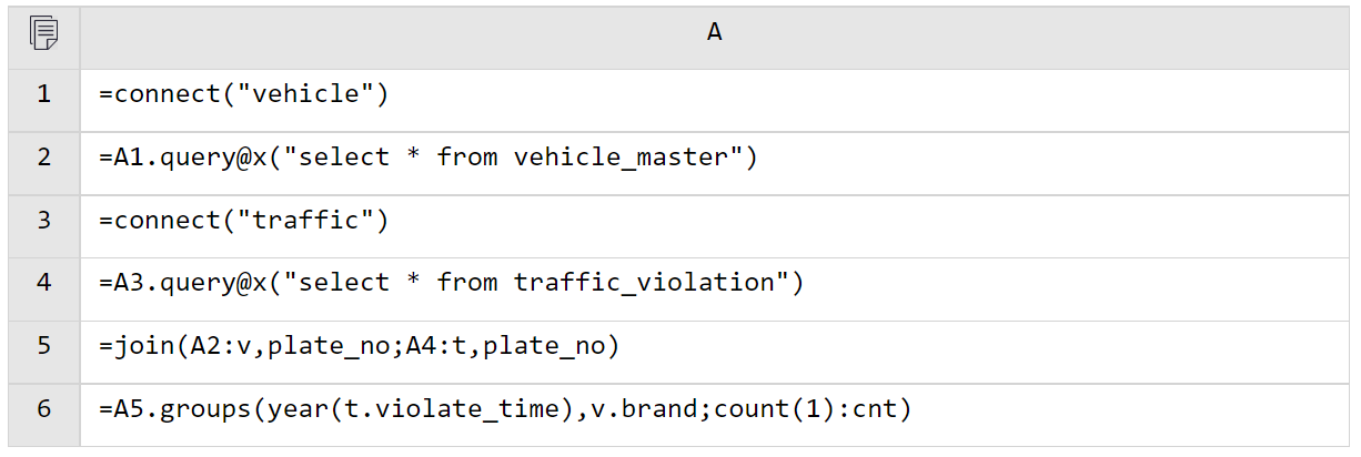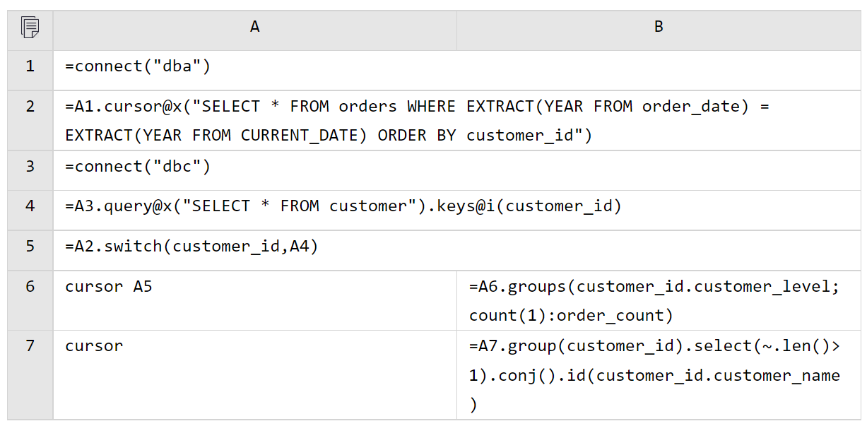 与全内存的写法大部分一样,区别在 A4 使用 cursor 创建游标分批读取数据。esProc 的游标是延迟游标,附加在游标上的计算等到最后取数时才会真正计算。