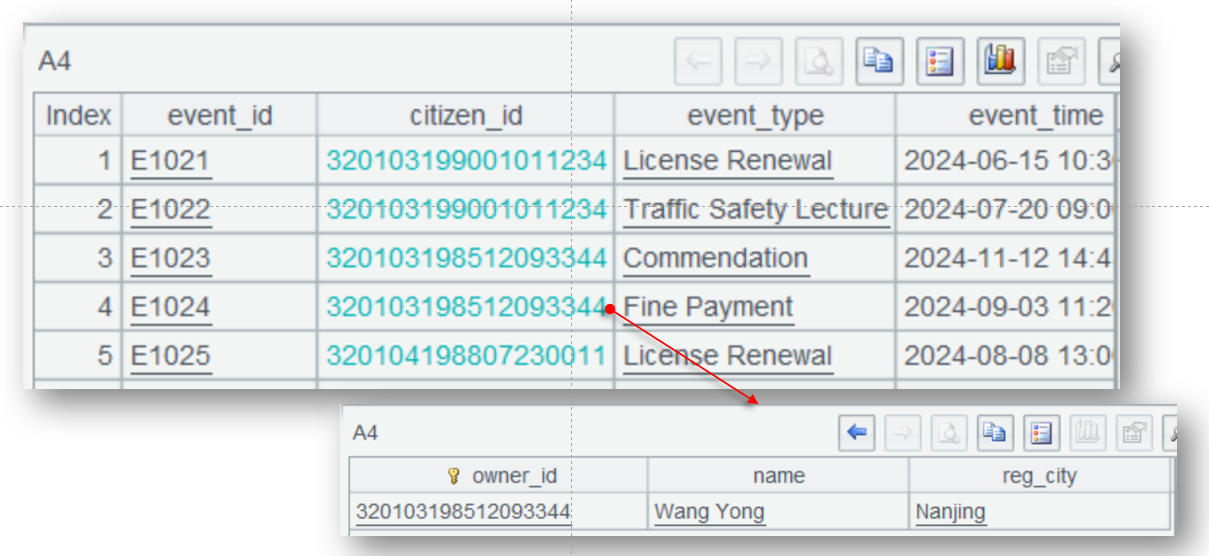 日常的等值 JOIN 基本都会涉及主键(多对多的关联基本没有业务意义),大体可以分为两种:维表关联是一种,是普通字段和维表的主键关联(如 citizen_event 和 owner_info);另一种是某个表的主键与另一个表的主键或部分主键的关联(如 vehicle_master 和 traffic_violation,traffic_violation 表中,可以把 plate_no 和 violation_id 视为共同主键,即 violation_id 是从属于 plate_no 的)。