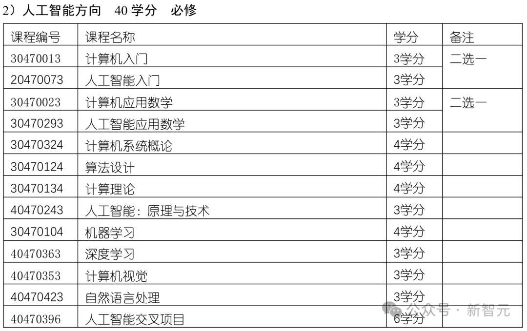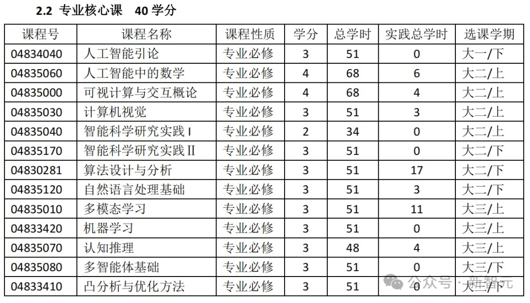 专业核心课中,包括人工智能引论、算法设计与分析、机器学习、多模态学习等。