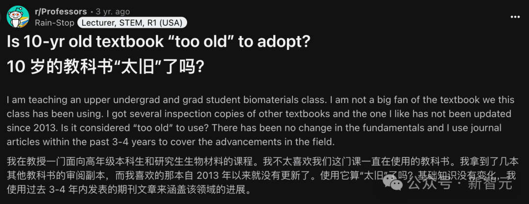 比如,这位网名Rain-Stop的生物材料教授称,虽然他喜欢的一本教材自从2013年就没有更新了,但是他使用过去3-4年内发表的期刊论文来涵盖领域内的进展。