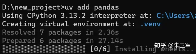然后在Python项目中添加依赖,使用uv add命令实现,比如uv add pandas