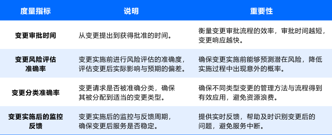 核心指标帮助团队评估变更管理的整体效果,衡量变更请求的处理速度、成功率以及对服务的影响。