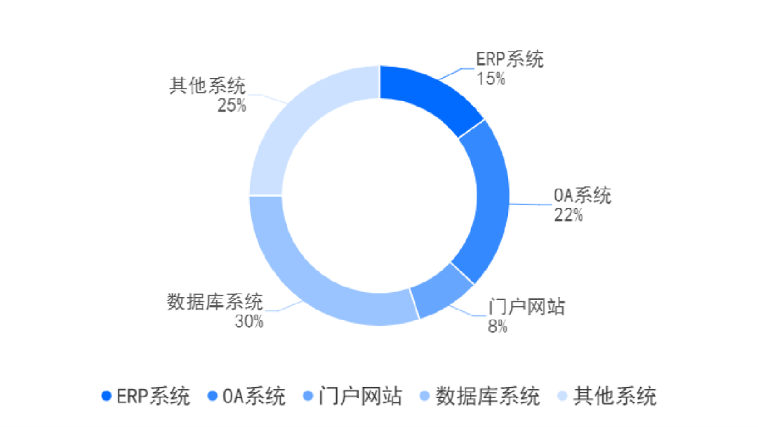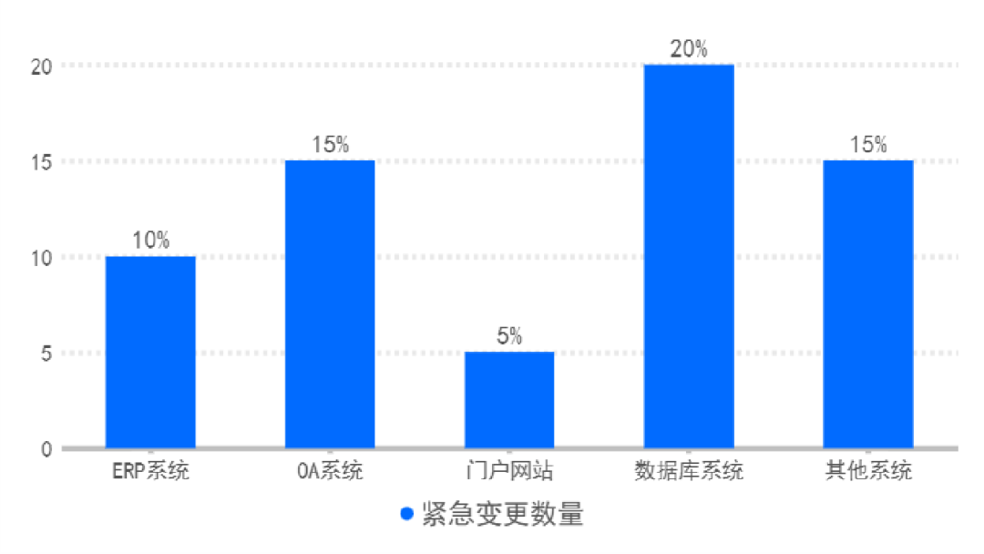从图表中可以看出,ERP系统和OA系统的紧急变更数量较多,占比分别为15%和22%,这表明这两个系统可能存在较多的稳定性问题或配置挑战,值得重点关注。数据库系统的紧急变更占比最大,达到30%,可能表明该系统在处理高并发或数据一致性等方面存在一定问题。通过对这些系统的进一步分析,可以识别出常见问题并采取优化措施。