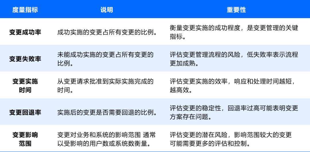 变更管理的度量指标帮助团队评估变更流程的健康状况,监控变更实施的效率与风险。以下是变更管理中常见的度量指标: