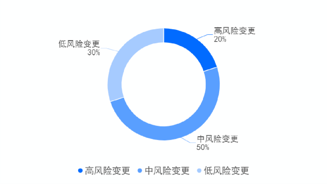 图表显示高风险变更占20%,中风险变更占50%,低风险变更占30%。这表明,尽管大多数变更处于中低风险范围,但仍有一定比例的高风险变更需要更加小心对待,可能需要更严格的审批和更详细的风险评估。