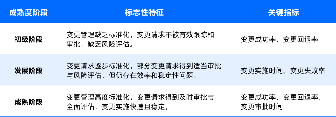 变更管理流程的成熟度识别有助于团队了解当前变更管理的水平,识别出需要改进的环节,并采取措施提升流程效率。变更管理的成熟度通常可以分为以下几个阶段: