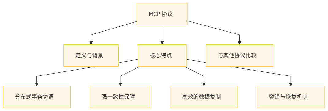 MCP 协议基于一个三层架构模型,包括事务发起者(Client)、事务协调器(Coordinator)和资源管理器(Resource Manager)。