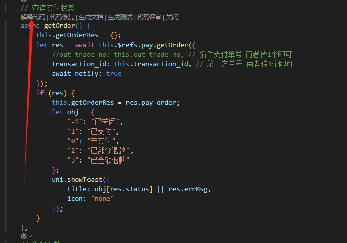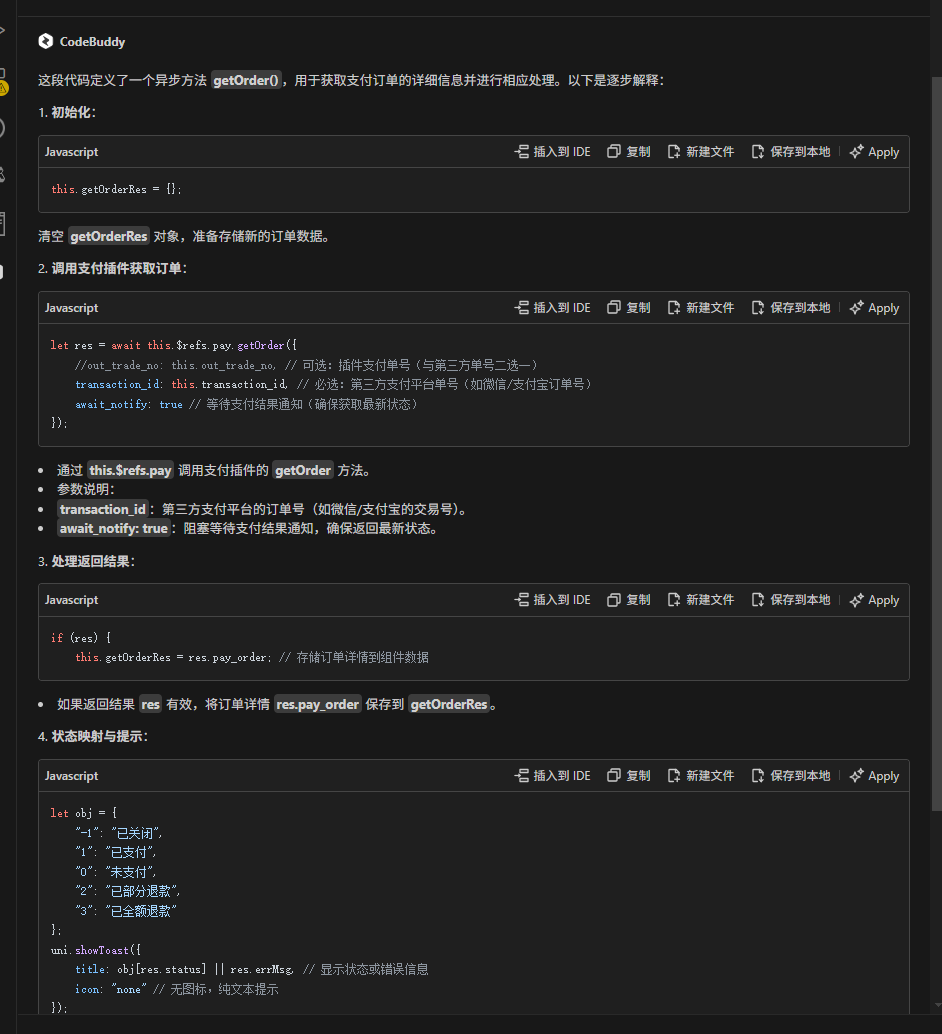 更令人惊喜的是,CodeBuddy支持对具体代码片段的详细解释。比如对于支付订单查询功能: