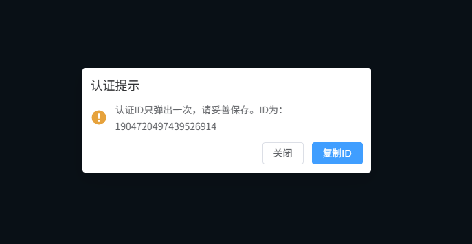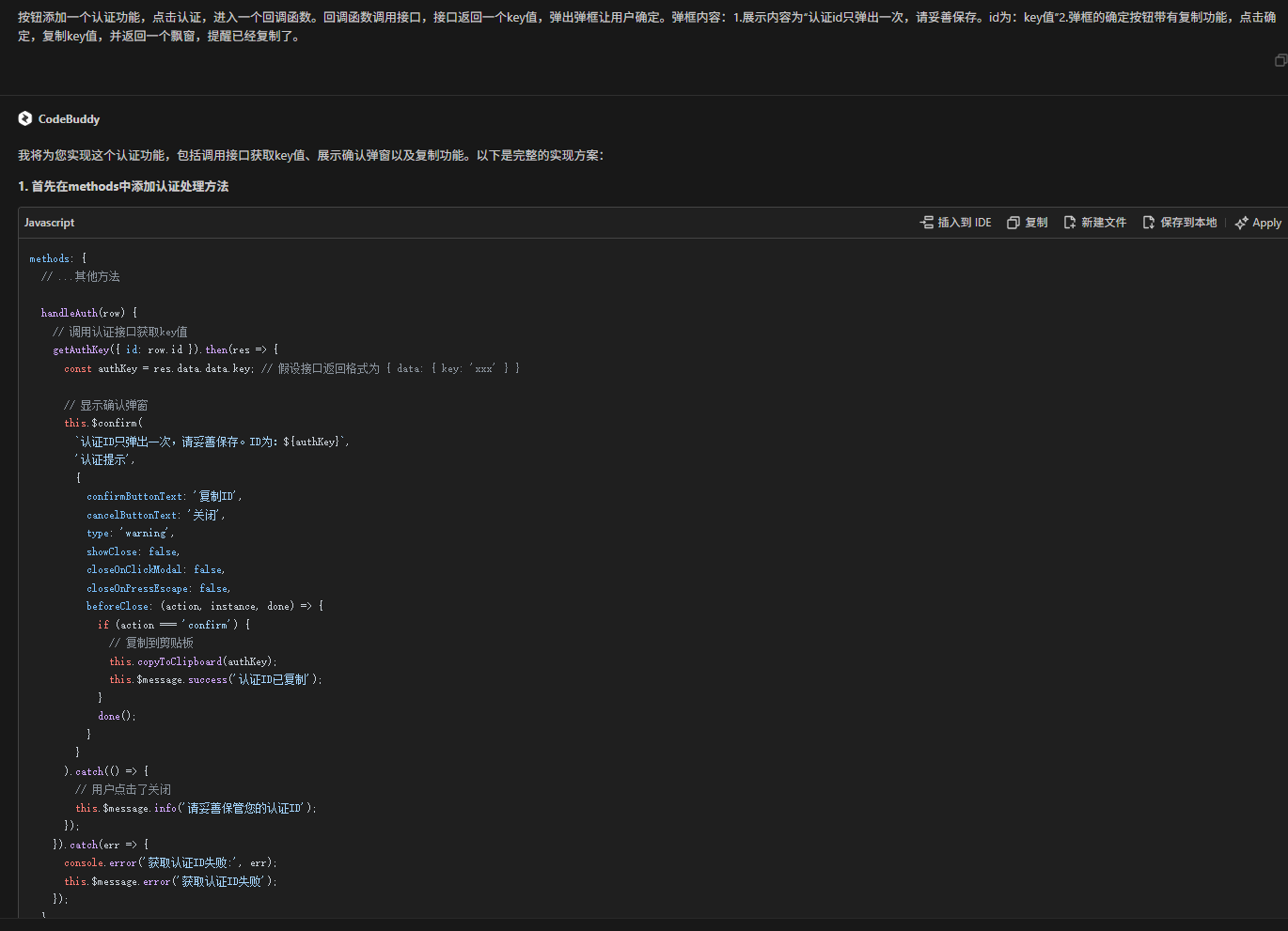输入指令:”按钮添加一个认证功能,点击认证,进入一个回调函数。回调函数调用接口,接口返回一个key值,弹出弹框让用户确定。弹框内容:1.展示内容为“认证id只弹出一次,请妥善保存。id为:key值”2.弹框的确定按钮带有复制功能,点击确定,复制key值,并返回一个飘窗,提醒已经复制了。“