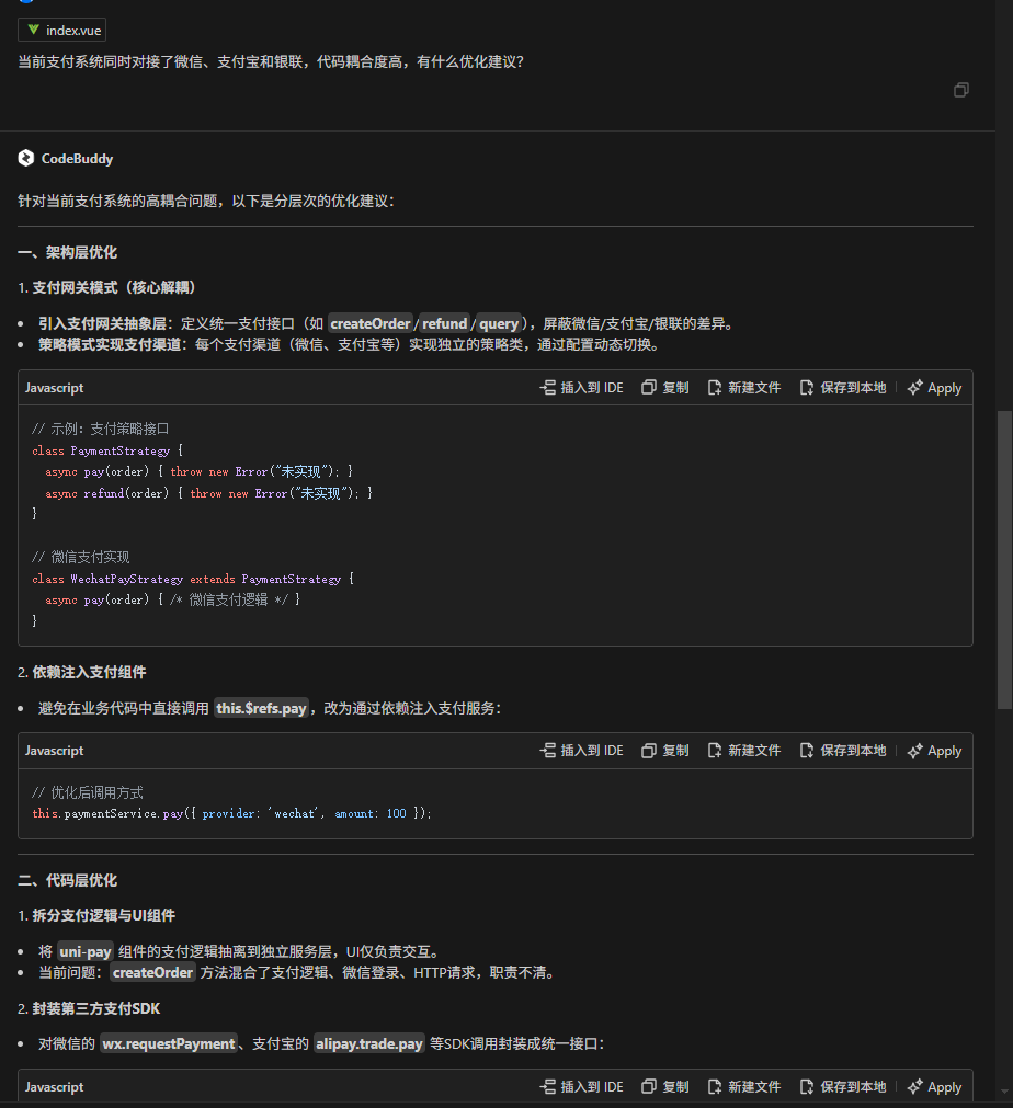 最近接手了一个基于uni-app的支付项目,代码量相当庞大,包含了微信支付、苹果IAP、华为支付等多种支付方式的实现。面对这样一个复杂的项目,我决定尝试用CodeBuddy来帮助快速理解代码结构。