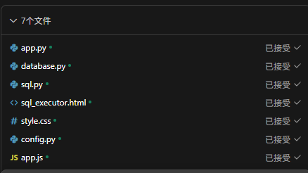 app.py 已成功创建,接下来需要创建 database.py 文件,包含 MySQL 连接和执行 SQL 的核心功能。