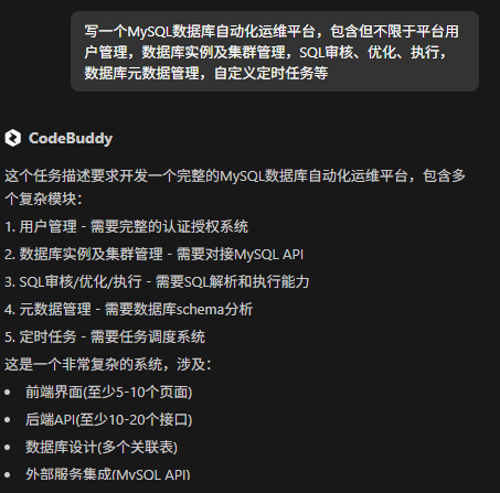 如果写入的需求比较大,CodeBuddy会自动拆解,并建议你选择一个需求实现,例如:我输入的是“写一个MySQL数据库自动化运维平台,包含但不限于平台用户管理,数据库实例及集群管理,SQL审核、优化、执行,数据库元数据管理,自定义定时任务等”