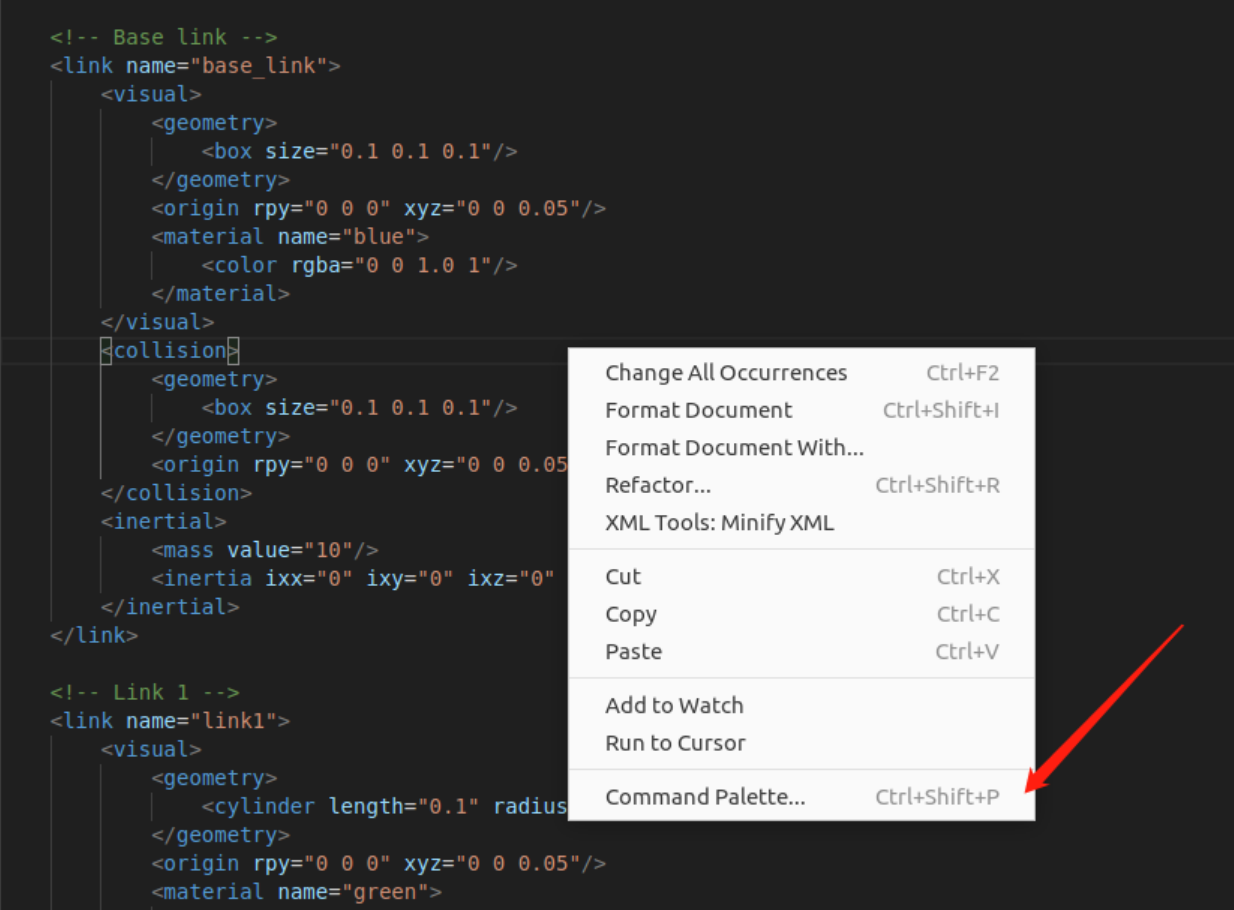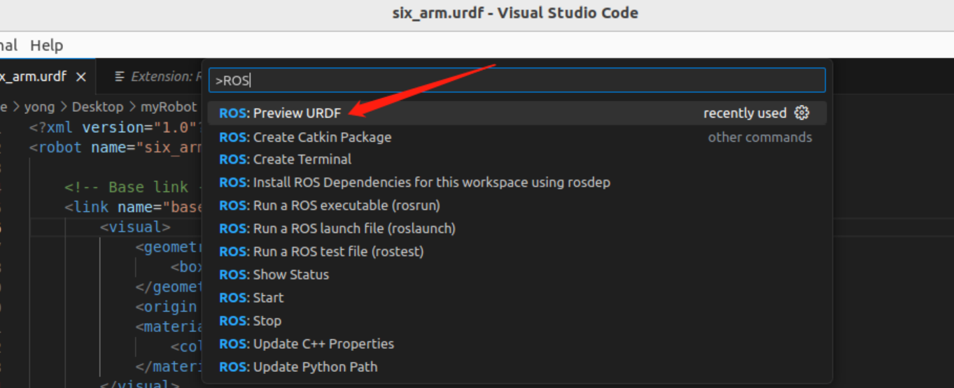 然后可以在urdf文件中右键–》command palette–》ROS:Preview URDF