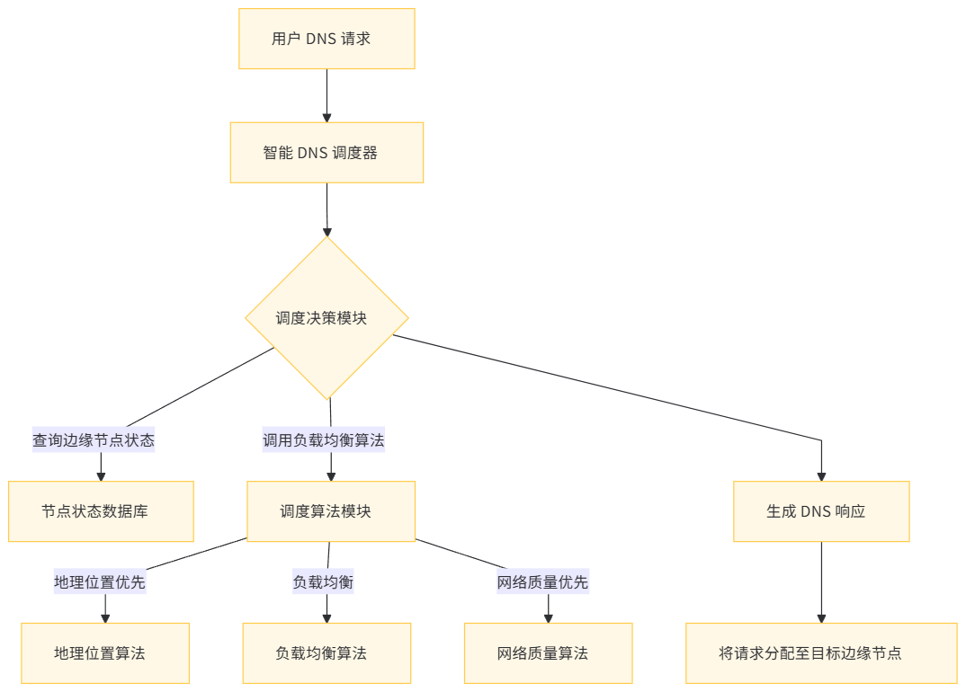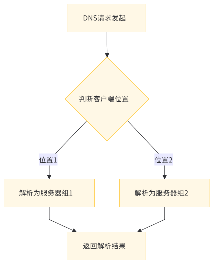 智能 DNS 通过分析 DNS 请求中的客户端 IP 地址等信息,结合预先配置的地理映射规则,将域名解析为不同地区最优服务器的 IP 地址。其工作流程如下图所示: