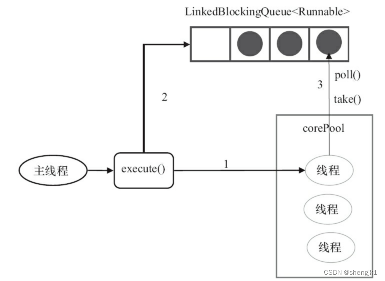 2.3.2 FixedThreadPool 的 execute 方法原理 如果当前运行的线程数少于corePoolSize,则创建新线程来执行任务。 在线程池完成预热之后(当前运行的线程数等于corePoolSize),将任务加入LinkedBlockingQueue。 线程执行完1中的任务后,会在循环中反复从LinkedBlockingQueue获取任务来执行。FixedThreadPool使用无界队列LinkedBlockingQueue作为线程池的工作队列(队列的容量为Integer.MAX_VALUE)。 使用无界队列作为工作队列会对线程池带来如下影响。