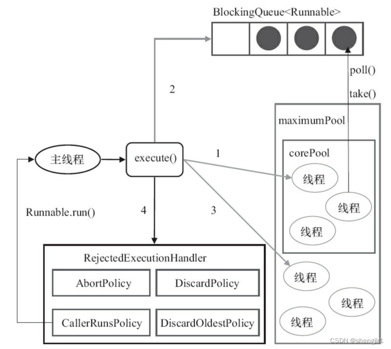 如果当前运行的线程少于corePoolSize,则创建新线程来执行任务(注意,执行这一步骤需要获取全局锁)。 如果运行的线程等于或多于corePoolSize,则将任务加入BlockingQueue。 如果无法将任务加入BlockingQueue(队列已满),则创建新的线程来处理任务(注意,执行这一步骤需要获取全局锁)。 如果创建新线程将使当前运行的线程超出maximumPoolSize,任务将被拒绝,并调用RejectedExecutionHandler.rejectedExecution()方法。 ThreadPoolExecutor采取上述步骤的总体设计思路,是为了在执行execute()方法时,尽可能地避免获取全局锁(那将会是一个严重的可伸缩瓶颈)。在ThreadPoolExecutor完成预热之后(当前运行的线程数大于等于corePoolSize),几乎所有的execute()方法调用都是执行步骤2,而步骤2不需要获取全局锁。