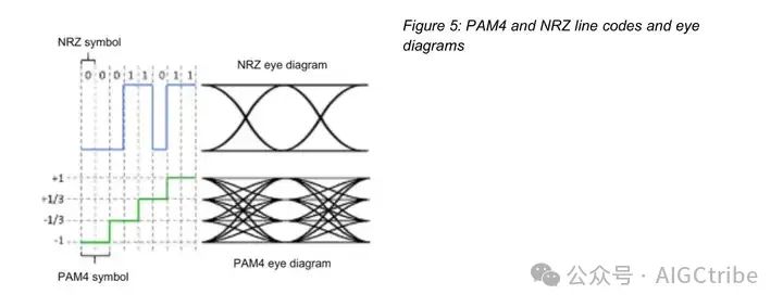 PAM4 线路编码:与 NRZ 相比,PAM4 用 4 个信号电平在一个符号中编码 2 比特,在相同带宽下实现更高速率,但信号电平低,信噪比降低,需 FEC 补偿。