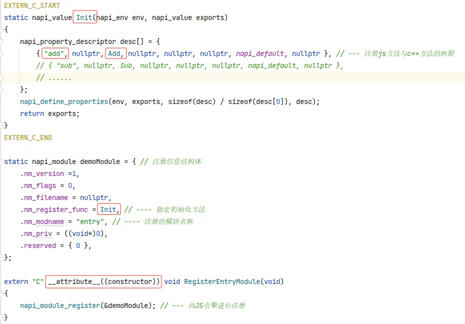 我们可以从下往上看这段代码:首先是 RegisterEntryModule(void) 方法。这是C++向JS引擎进行NAPI模块与方法注册的起始代码。注意这个方法前面有个编译修饰符 "attribute((constructor))",它的作用是指导C++代码的编译,使得当so库被加载到应用进程中时,RegisterEntryModule(void) 方法就会被自动调用到。该方法通过NAPI接口napi_module_register() 向JS引擎注册了一个 napi_module。
