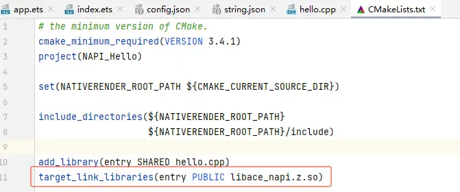 OpenHarmony的NAPI接口实现都封装在libace_napi.z.so中,C++程序编译时需链接此库。对于DevEco Studio应用开发的cpp代码,在对应的CMakeLists.txt中链接。该库文件在SDK目录下可以找到。