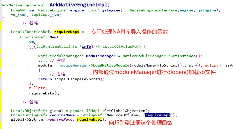 也就是说,每个应用进程的JS引擎中,都注册了一个"requireNapi"函数,当应用调用此方法时,JS引擎就会通过NAPI框架的moduleManager类去处理so库的加载。moduleManager内部最终是找到了/system/lib/module下对应的so文件,并通过dlopen()的方式加载到应用进程中。想了解细节的小伙伴可以读一下NativeModuleManager::LoadNativeModule()方法的内部实现。