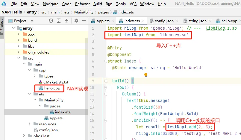 除了系统自带的NAPI库,应用也可以用C++开发自己的NAPI库。上面例子中 import testNapi from 'libentry.so' 导入的就是应用自己实现的。应用开发的NAPI库会随着应用工程一起编译打包到hap文件中,最终部署到/data目录每个应用自己的文件夹下。